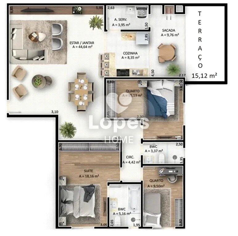 O imóvel é novo e possui 151,25 m² de área privativa, sendo 136,13 m² de área interna e 15,12 m² de garden suspenso, ideal para quem busca conforto, integração com área externa e qualidade de vida.