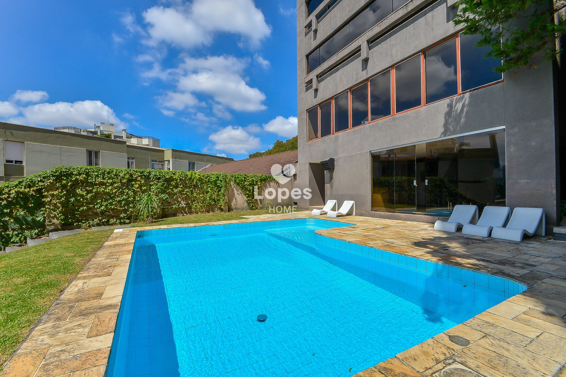 Condomínio com piscina e salão de festas.